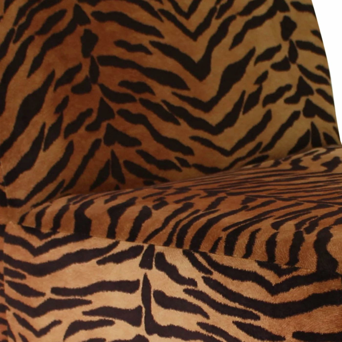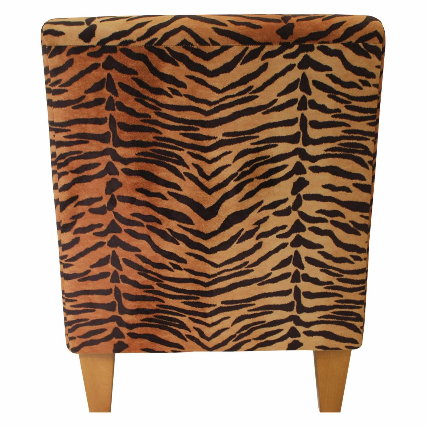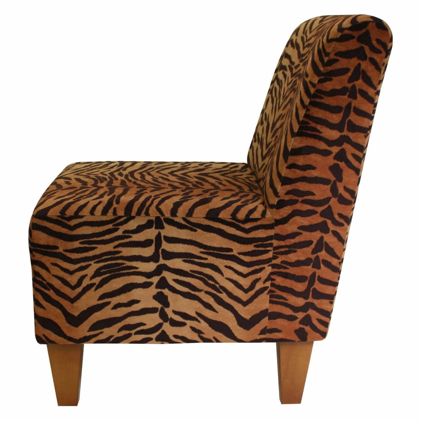 Youβll relish the Fox Hill Penelope Tiger Print Armless Slipper Chairβs primal print! Tiger stripes cover this slipper chairβs sleek, contemporary silhouette. Tapered, black wood block legs lend contemporary charm. This wood-framed chair offers ample width and sits slightly lower to the floor than most chairs. Furthermore, itβs made in the USA and arrives almost completely assembled. You just have to screw on the legs.