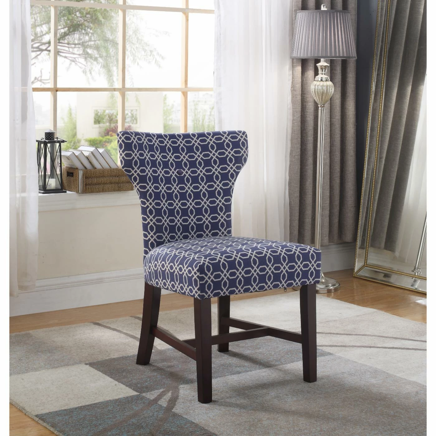 The Best Master Furniture Belle Geometric Upholstered Accent Chair adds a dynamic pattern and deep color to enliven your bedroom or living room design. This armless accent chair is supported by a tough wooden frame with block legs. A dark brown finish tops the exposed wood. The flared backrest and wide seat are each padded with high-density foam for comfort. A deep blue polyester blend fabric upholsters the chair, accented with a white overlapping circle pattern.