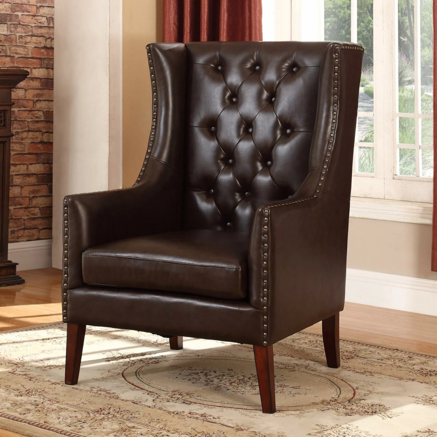 The Best Master Furniture Traditional Faux Leather Executive Wingback Chair is perfect for any den, living room, or office. It rests on durable wooden feet and is upholstered in rich brown faux leather. Button tufting and nail head trim add stately presence to this wingback chair. The high-back design and plush foam padding offer comfortable support as you sit.