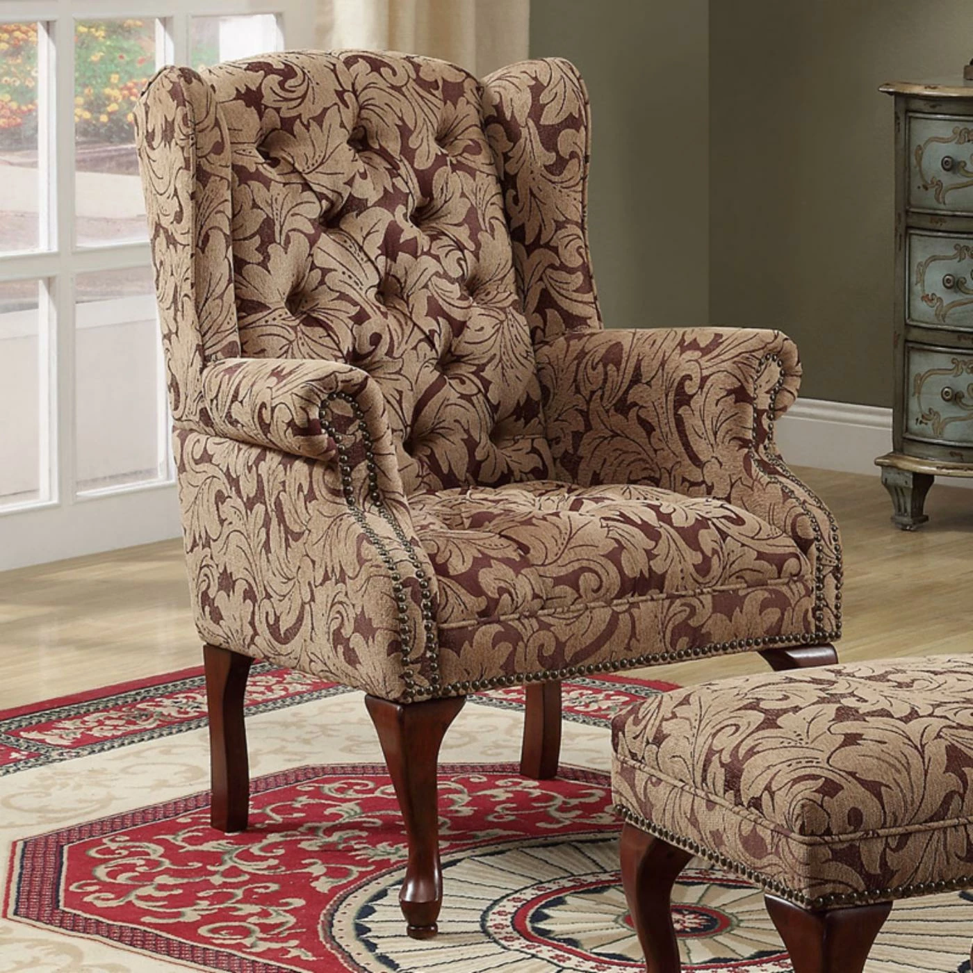 Add classic comfort to your sitting room or reading nook with this Coaster Furniture Lancaster Wingback Accent Chair. The traditional wingback design is accented with deep button tufting and enhanced by rolled arms with nail head trim. This wingback chair is upholstered in a burgundy and light brown floral pattern.