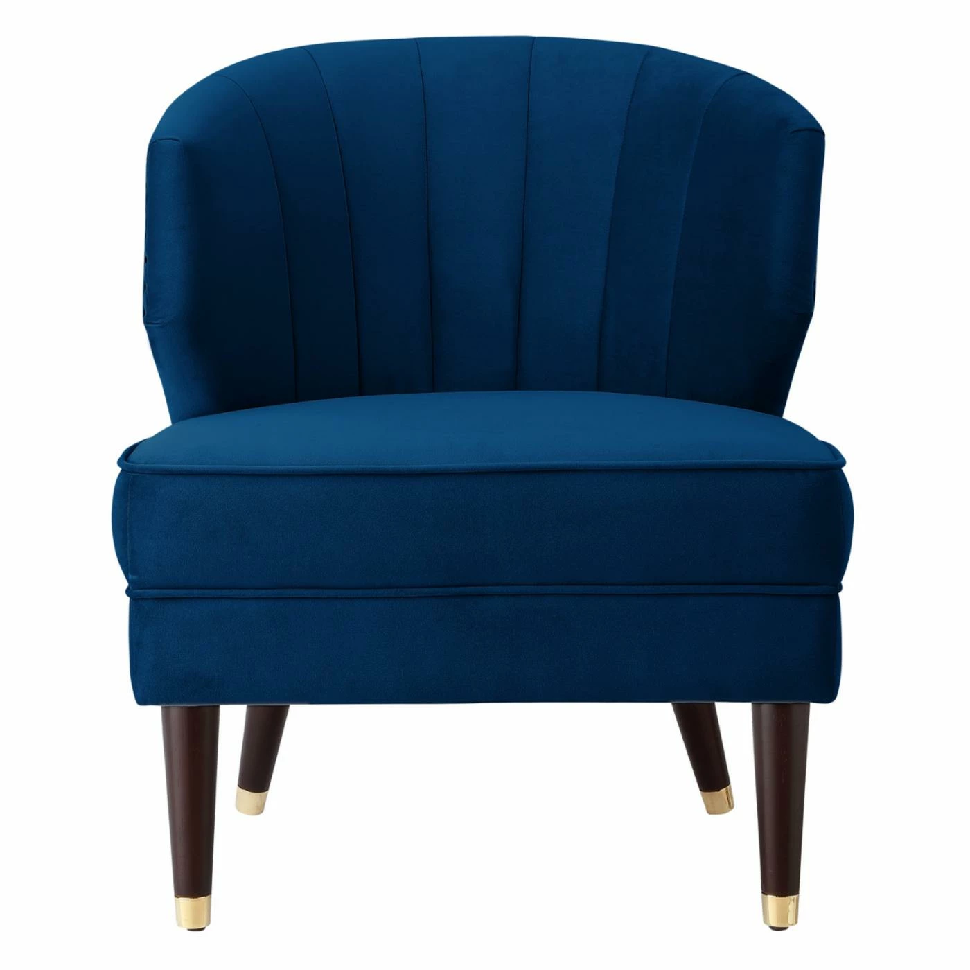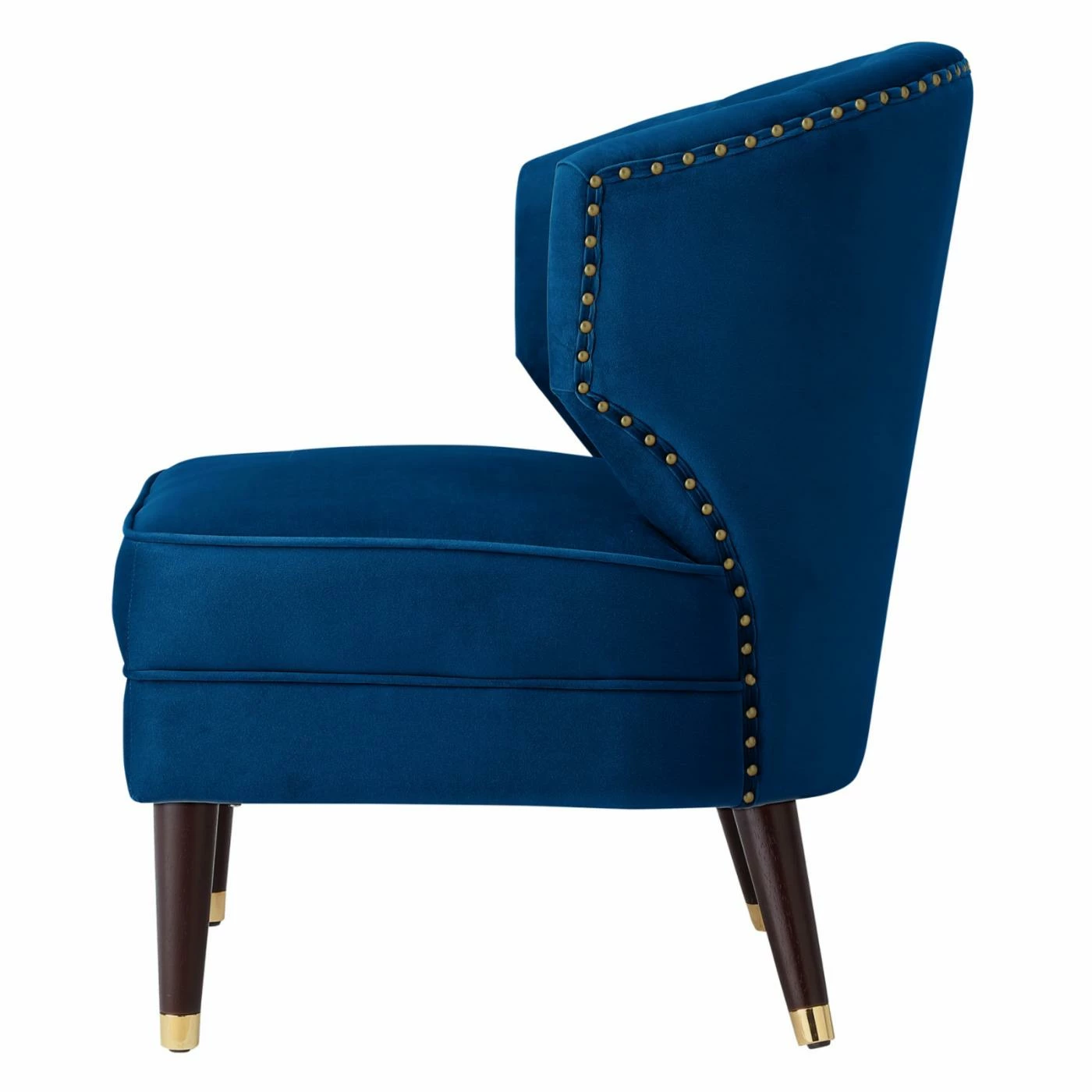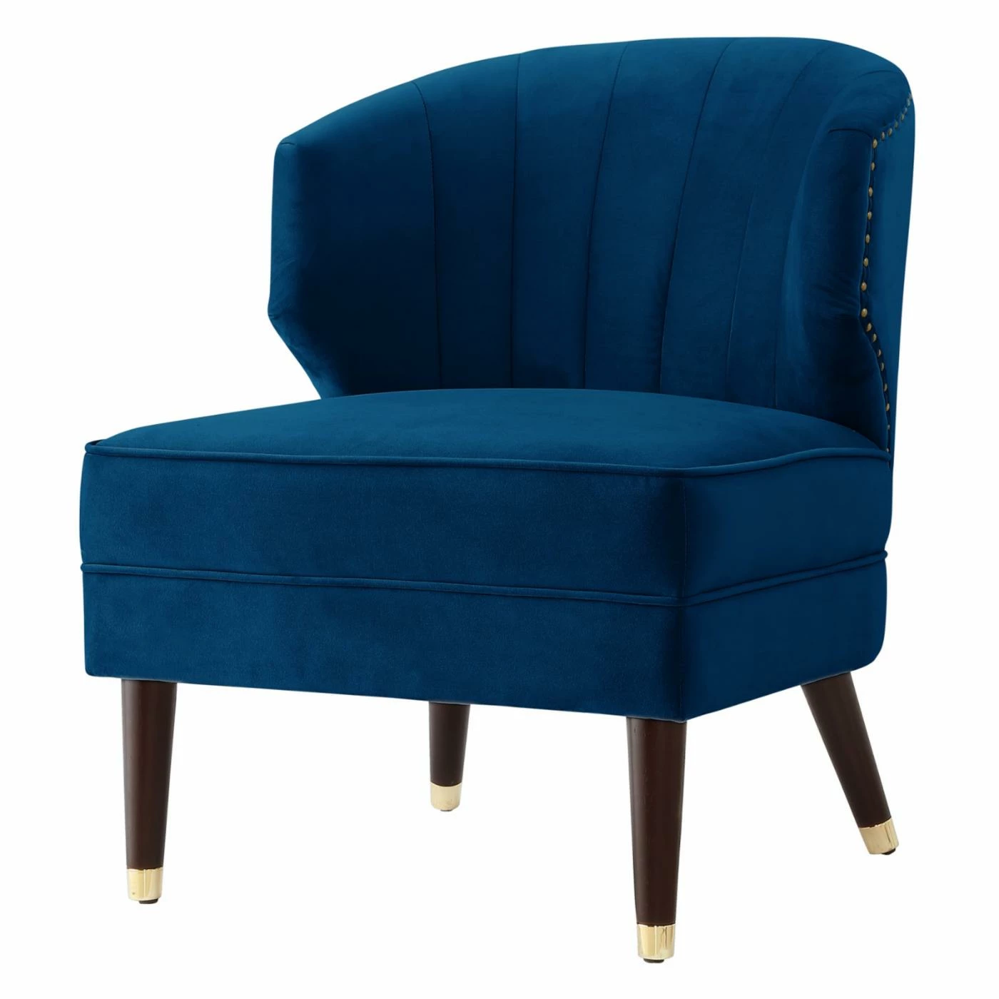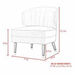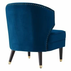 The Nicole Miller Castiel Velvet Slipper Accent Chair combines elements of glam and mid-century modern style for a luxe, elegant addition to your modern living room. Velvet upholstery in your choice of available color covers the seat and back. Channel tufting adds texture and a little shine is provided by the metal caps on the legs and nailhead trim on the back of the accent chair.