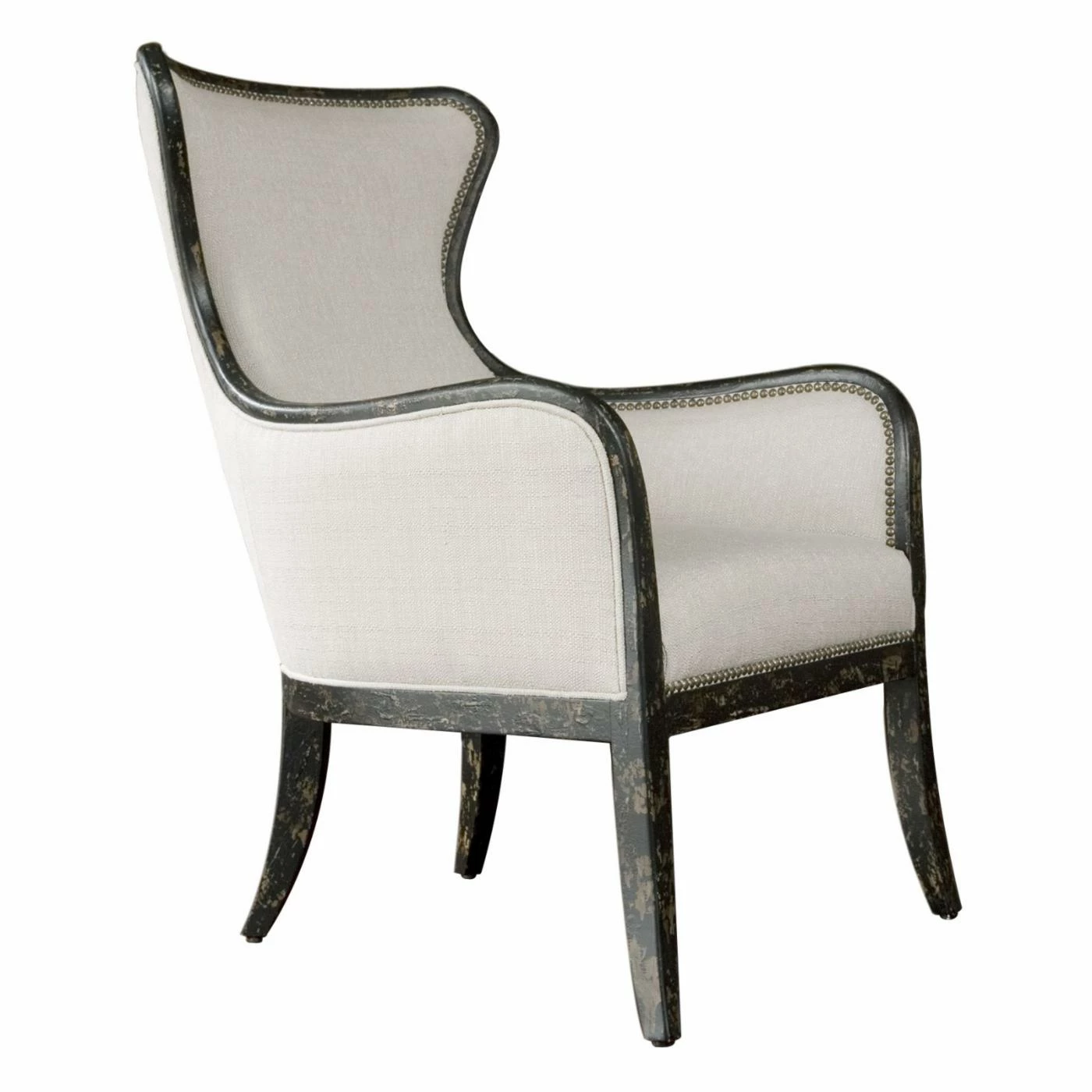 Elegant and stylish this wing chair adds a touch of sophistication to your home decor. The Uttermost Sandy Wing Chair has a shimmering sandy white fabric that is coated with Teflon to protect it from spills dust and stains. It has a solid mahogany wood frame with reinforced joinery for sturdy support. Brass nail-head trim and hand-laid weathered black finish complete the allure of this chair. A matching love seat is available with this wing chair.